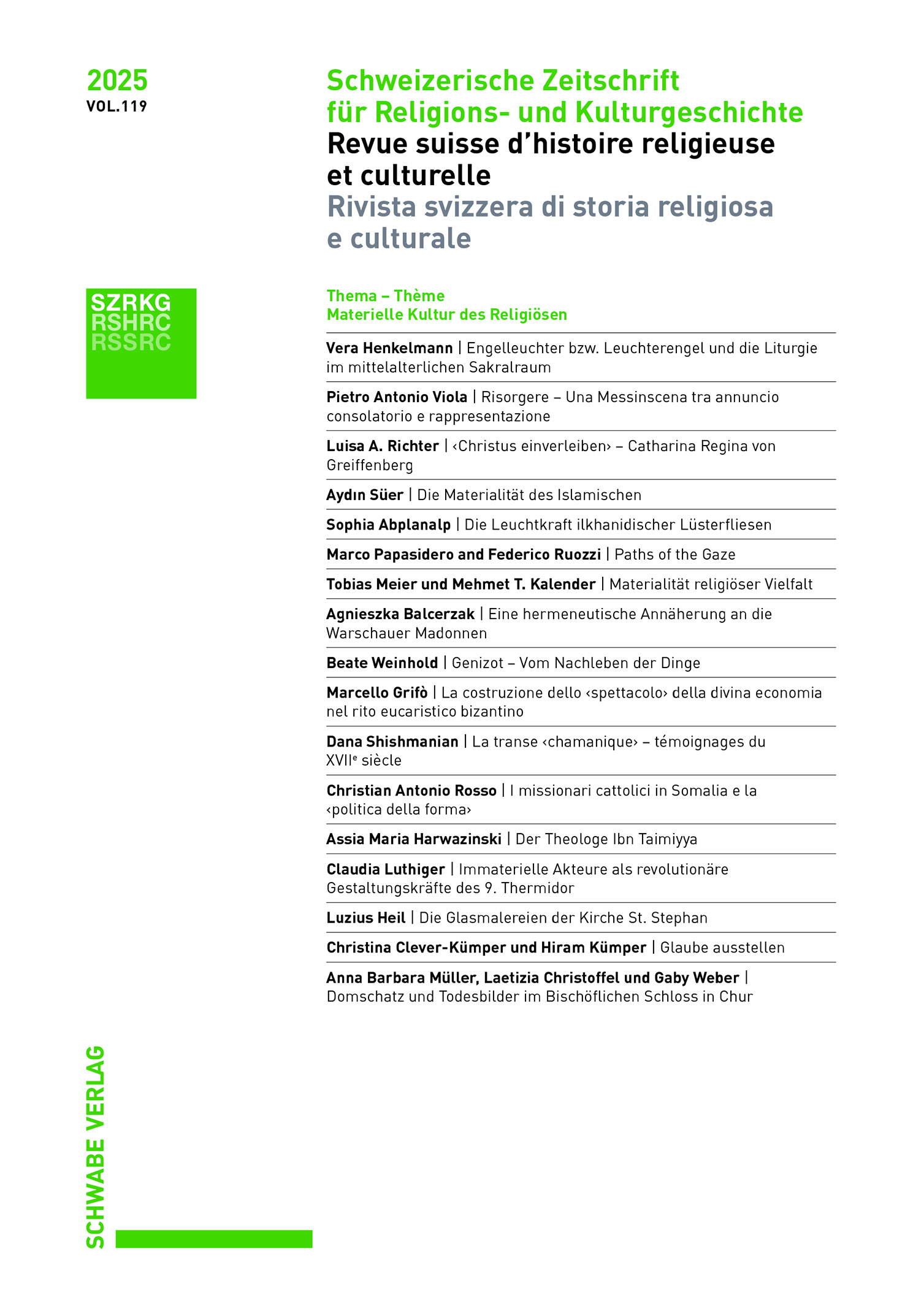 Im Themenschwerpunkt der diesjährigen SZRKG widmen sich 22 Autorinnen und Autoren aus Italien, Frankreich, Deutschland, Österreich und der Schweiz Themen der Materialität von Religion. Toutes les époques sont prises en compte, et les contributions portent non seulement sur lʼhistoire de la religion chrétienne, mais aussi sur celle des religions juive et islamique, ainsi que sur des aspects systématiques et méthodologiques. Questi ultimi si dedicano in particolare alle questioni relative alla rappresentazione della religione nei musei, allʼesperienza religiosa negli spazi sacri, alle pratiche del vedere e del mostrare e al rapporto tra oggetti e persone. The transdisciplinary focus, which presents research results, ongoing projects and fundamental reflections, is intended to stimulate further research, particularly comparative studies of different religions, historical periods and geographical locations.