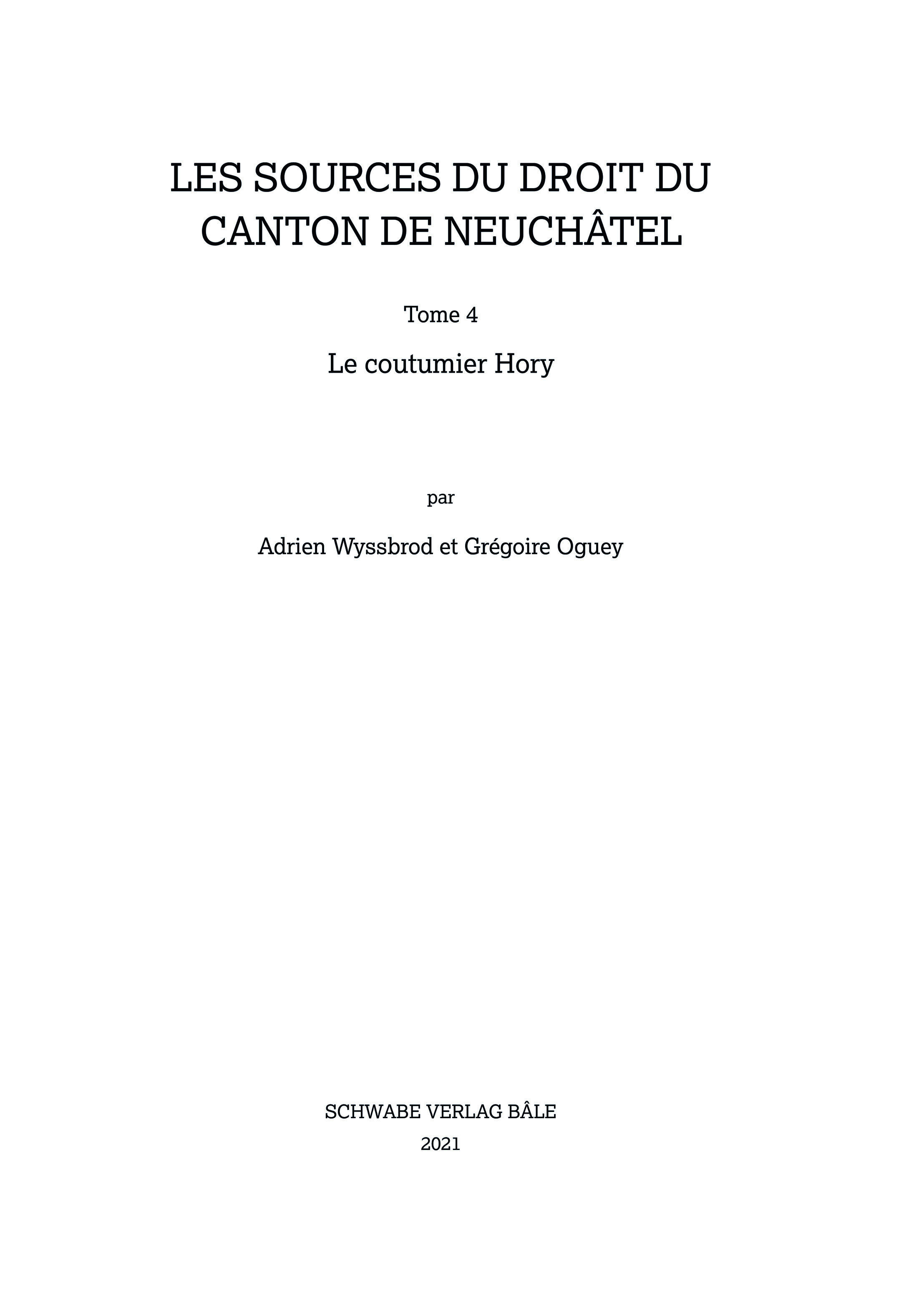 Commandé au chancelier Jean Hory par les Orléans-Longueville au début du XVIIe siecle, le coutumier Hory constitue un projet tres abouti de mise par écrit de la coutume neuchâteloise. En raison de la résistance du Petit Conseil, ce coutumier n’est jamais entré en vigueur. Il demeure toutefois un témoin privilégié du droit neuchâtelois, ainsi qu’une ambitieuse tentative de systématisation de la coutume, voire un essai précoce de codification.