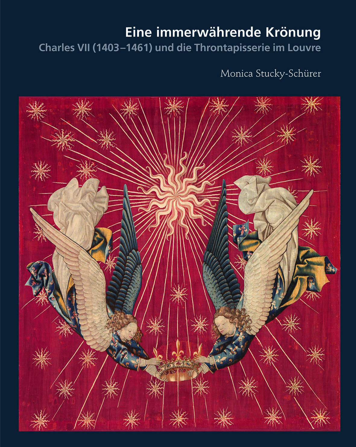 Aufgrund der französischen Lilien und der Sonnensymbolik kann eine bisher unbekannte, 2010 durch den Louvre erworbene spätgotische Tapisserie Charles VII zugewiesen werden. Wie historische Ereignisse nahelegen, dürfte sie in Flandern im Zeitraum zwischen 1453 und 1461 entstanden sein. Stilvergleiche mit der Buchund Tafelmalerei verweisen den Entwurf in die künstlerische Nähe zu Jean Fouquet, welcher auch für das bedeutende Bildnis von Charles VII im Louvre verantwortlich ist. Die englische Besetzung Frankreichs während des Hundertjährigen Kriegs hinderte den Dauphin daran, als Charles VII die rechtmässige Thronfolge anzutreten. Er musste als roi de Bourges – wie ihn seine Gegner hämisch nannten – so lange auf die Königswürde warten, bis ihn die Jungfrau von Orléans, Jeanne d’Arc, 1429 zu seiner Krönung nach Reims führte und damit den Weg ebnete für die Befreiung Frankreichs von der Suprematie Englands. Der Krönungsritus, der sacre du roi, kommt als Anlass für den Auftrag der Tapisserie jedoch aus stilistischen Gründen nicht in Frage, vielmehr muss der Thronbehang nach dem Friedensschluss mit England (1453) und vor dem Tod von Charles (1461) entstanden sein. Charles VII wäre die Befriedung und der Aufstieg seines Reichs zu einer geeinten Nation nicht gelungen, hätte er sich nicht auf die Loyalität und materielle Unterstützung seines Hofstaats verlassen können. Die Ausleuchtung seines Umfeldes lässt ein dichtes Gefüge von menschlichen Beziehungen sichtbar werden, welche auch Charles’ Mentalität, seine Stärken und Schwächen verständlich machen. Der Behang mit der Funktion einer Thronrückwand erfüllte den Legitimationsanspruch dieses französischen Königs auch noch mehr als zwanzig Jahre nach seiner Krönung und unterstrich dessen immerwährenden Status als «Herrscher von Gottes Gnaden».