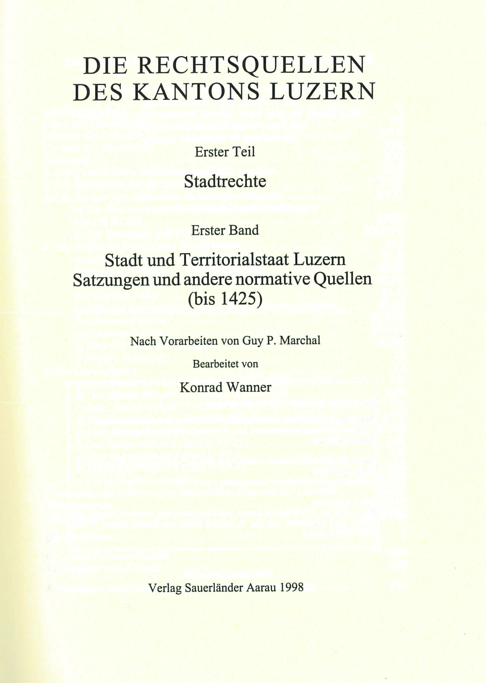 „Der hier vorliegende erste Band des Teils «Stadtrechte» der Rechtsquellen des Kantons Luzern vereinigt die in Luzern selbst entstandenen Quellen normativen Charakters bis 1425, soweit sie die Stadt Luzern, die Gesamtheit des städtischen Territoriums oder wenigstens einen grossen Teil des Territoriums betreffen. Der zweite Band wird die entsprechenden Quellen der Zeit von 1426 bis ca. 1480 wiedergeben. Ein dritter Band soll den im Zeitraum der Bände 1 und 2 aufgezeichneten Rechtsquellen gewidmet sein, die keinen normativen Charakter aufweisen oder nicht in Luzern entstanden sind (z. B. Bundesbriefe, Gerichts- und Schiedsurkunden, Herrscher- und Papstprivilegien). Einige weitere Bände sind für die Zeit von ca. 1480 bis 1798 vorgesehen. Diese sollen stärker nach systematischen Gesichtspunkten gegliedert werden.